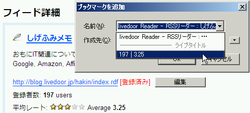 livedoor Reader - RSSリーダー : しげふみメモ といったフィード詳細ページで、ブックマークする時にプルダウンメニューからライブタイトルを選択すれば、登録者数と平均レートが自動更新されて表示されます。