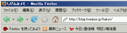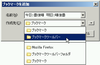 [画像:Firefoxでブックマークツールバーに天気予報を表示]