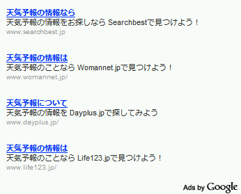 前回の記事(Firefoxでブックマークツールバーに天気予報を表示)に表示された AdSense がすごいことになっていたので、記念にスクリーンショットを取っておきました。