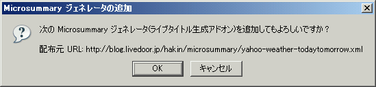 まず、Yahoo!天気情報をライブタイトルでブックマークできるように Microsummary ジェネレータ(ライブタイトル生成アドオン)というものをインストールします。