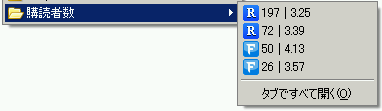 livedoor Reader と Fastladder での現在の自分のブログの index.rdf と atom.xml のフィードの詳細ページをブックマークして、購読者数というフォルダに入れてみました。