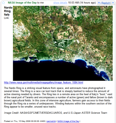 NASA Featured Images and Galleriesの RSS を元に Plagger で Gmail に送って、画像をキャプション付きで Gmail で見ることができるようにしています。