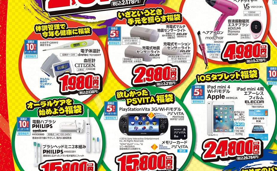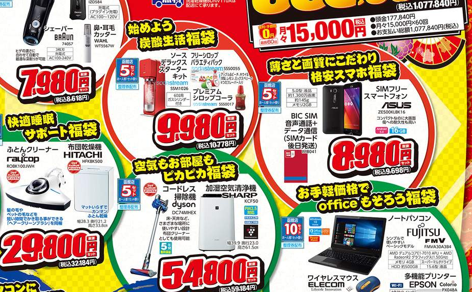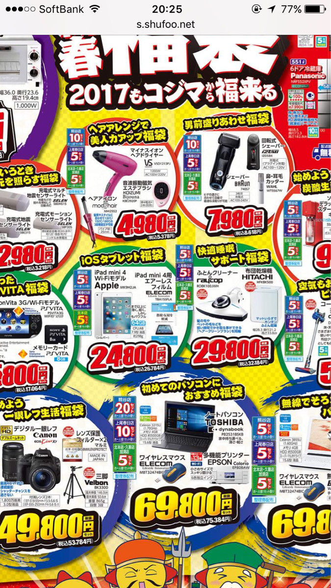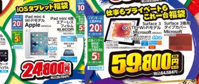 ビックカメラ系列のコジマがチラシを配布しました。そこには福袋の内容がかかれており、例年通りであればビックカメラ、ソフマップ、コジマは同一商品が投入されるため(なぜかコジマだけ値段は高い)、ビックカメラのiOSもiPad mini4 の64GBであることがほぼ確定となります。また、Surface袋もSurface3でほぼ確定