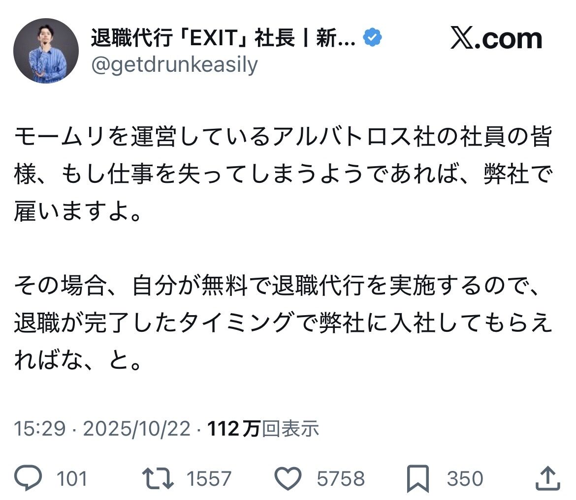 — 退職代行「EXIT」社長丨新野俊幸 (@getdrunkeasily) October 22, 2025