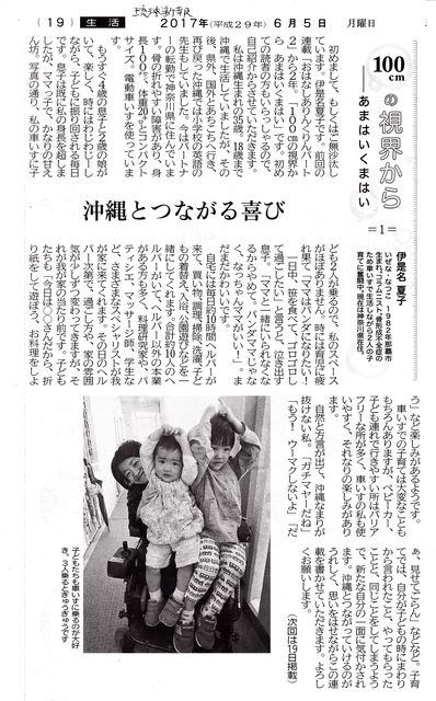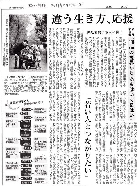 初めまして、もしくはご無沙汰しています。伊是名夏子です。琉球新報の連載「おはなしありんくりんパート2」から2年。「100cmの視界から あまはいくまはい」です。初めての読者の方もいらっしゃるので、自己紹介からさせていただきます。