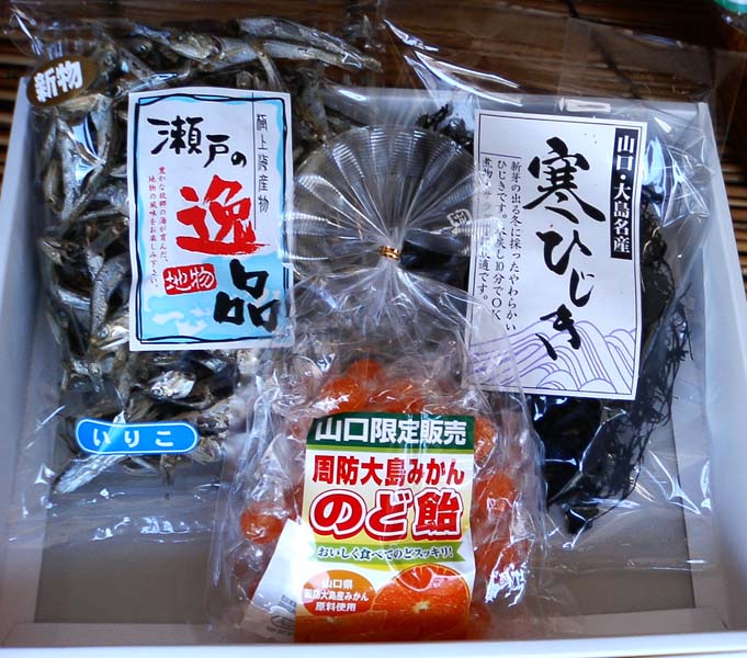 1・故郷の土産物(寒ひじき・いりこ・みかんのど飴)のセット