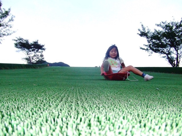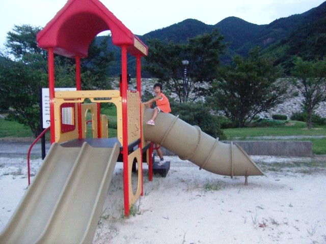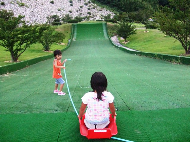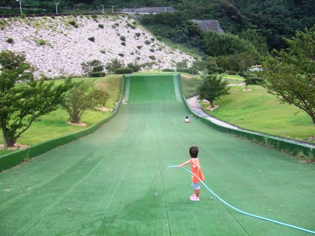 ダムのすぐ傍にはグランド滑り台?があります 水を撒いているのは滑りを良くするためです