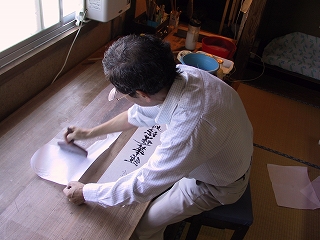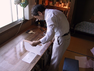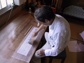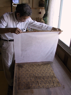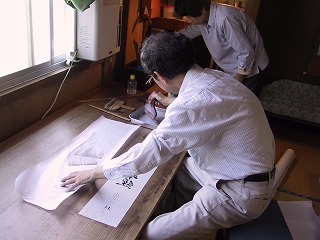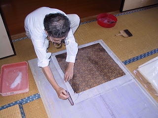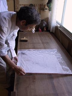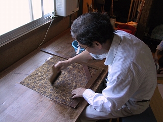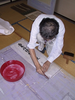 刷毛で本紙と裏打ち紙を張り合わせる作業です。