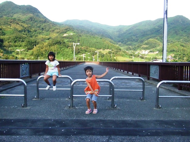 jump堤頂遊歩道で飛び跳ねる次女と三女