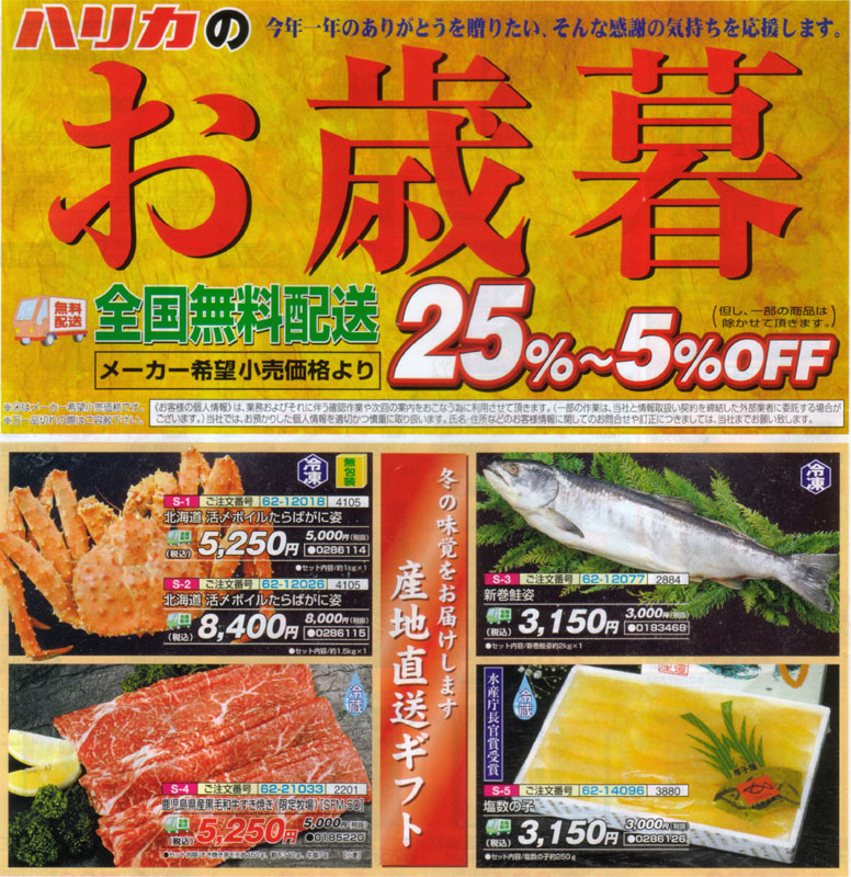 かに・新巻鮭姿・黒毛和牛すき焼き・塩数の子