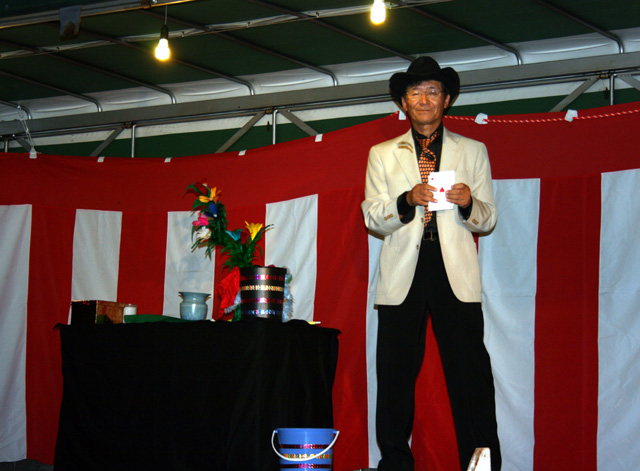 ステージには、けさび太鼓や童謡歌手 聖前正子さん