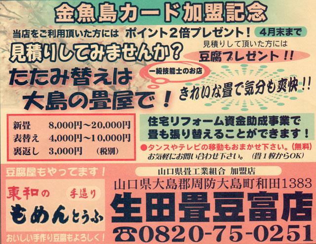 周防大島町商工会のポイントカード 金魚島カードに新しい加盟店が加わりました。