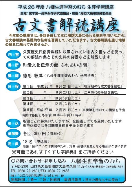 八幡生涯学習のむら「古文書解読講座」のお知らせ