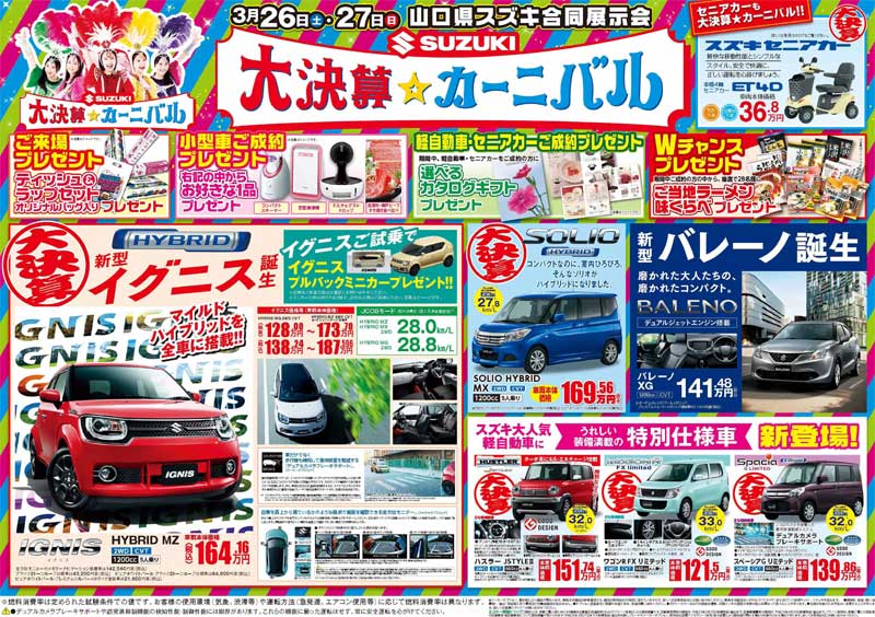 山口県スズキ合同展示会「スズキ大決算市カーニバル」を開催します。