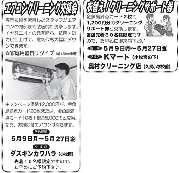 Kマート(小松)と奥村クリーニング店(久賀)で、金魚島満点カード2枚で