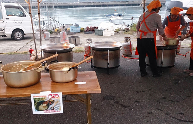 周防大島町婦人会が、大島名物の茶がゆを炊いて、振る舞いました。