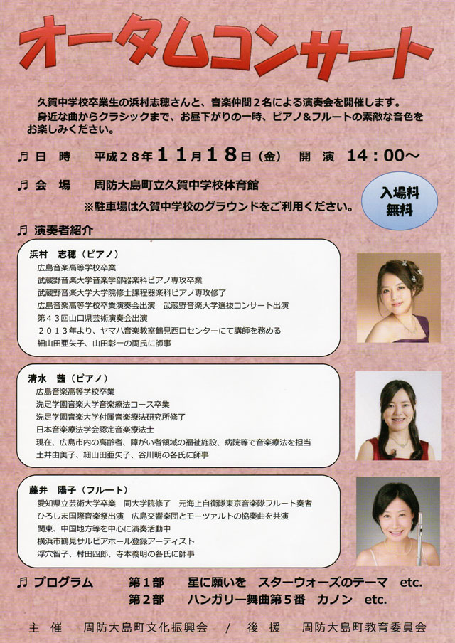 11月18日(金)14時から、久賀中学校体育館で開催されます。