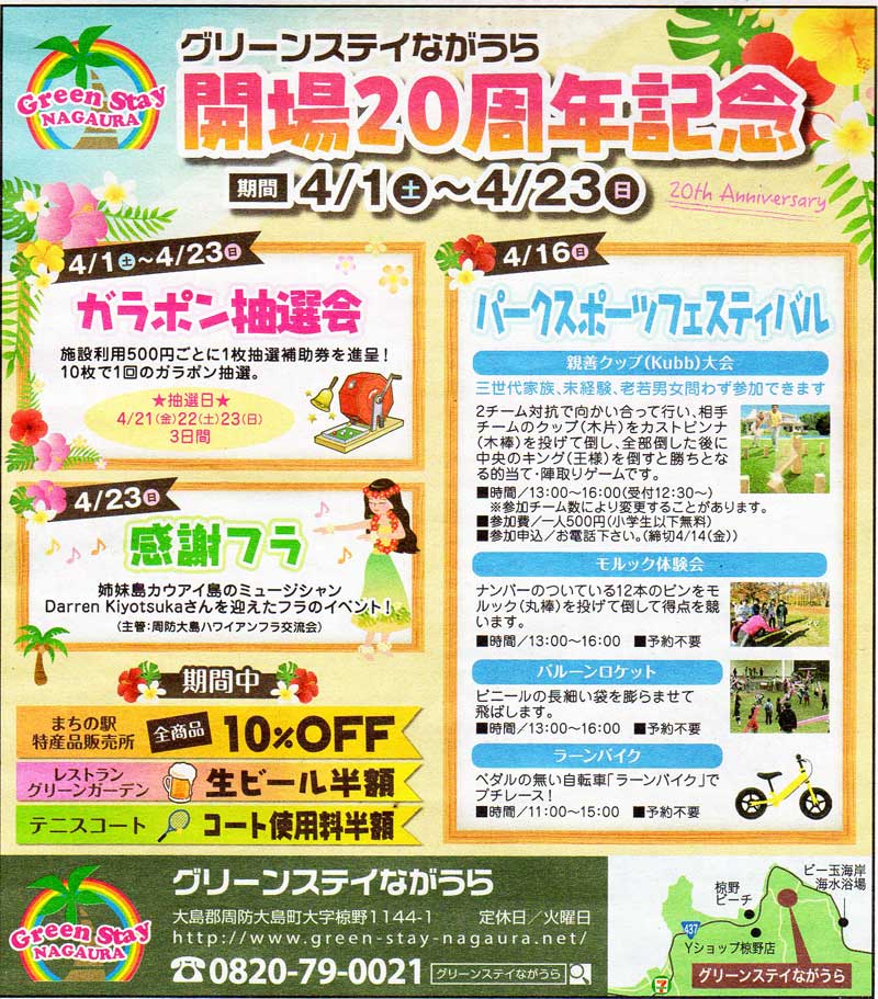 グリーンステイながうらは、今年で開場20周年を迎えます。