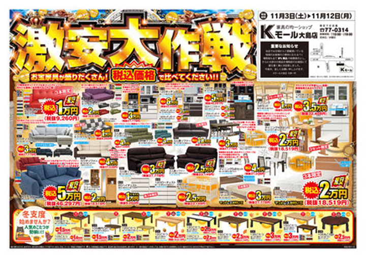周防大島町東安下庄にあります家具の均一ショップKモール大島店では、