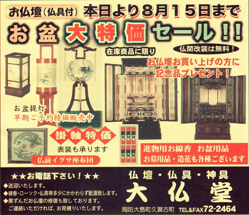 お盆提灯・お仏壇・掛軸・進物用お線香・お墓用品・造花などが
