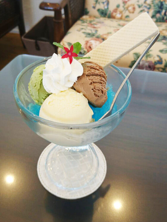 ブルーハワイのかき氷の上に、3種類のアイスをデコレートした