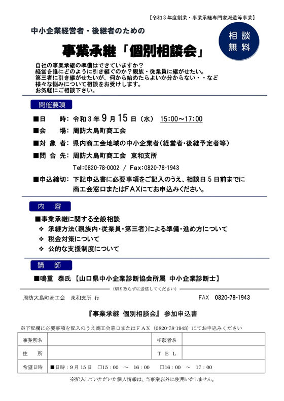 周防大島町商工会より事業承継「個別相談会」のお知らせです。