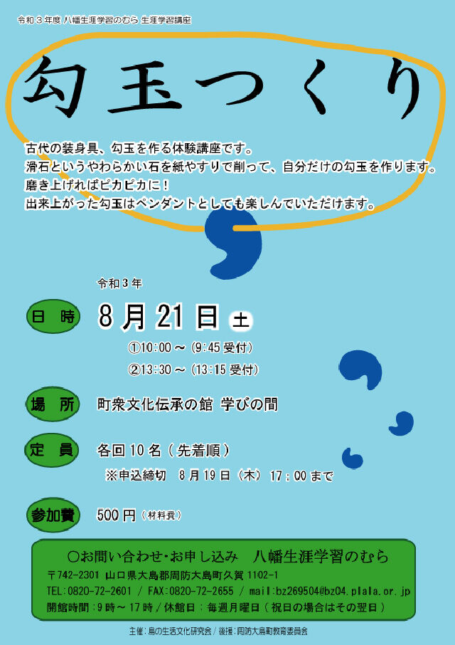 八幡生涯学習のむら「勺玉つくり体験講座」のお知らせ