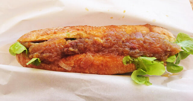 フランスパンに自家製ベーコンを包んでいるベーコンカスクートです。