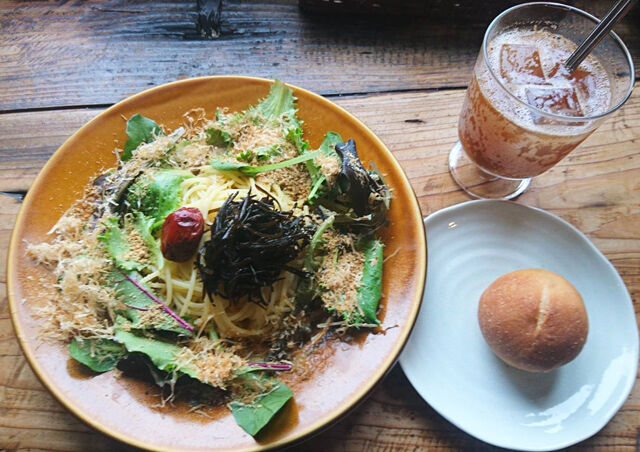 かつお節に、梅干しを添えた さっぱりと食べやすいパスタです。