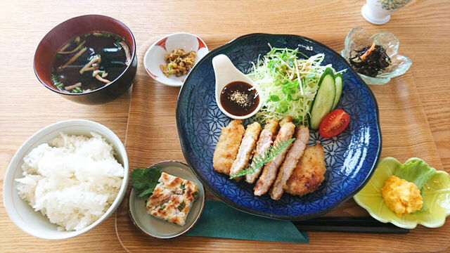 画像は、とんかつ定食です。手作りの副菜も充実しています。