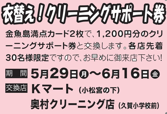 金魚島カード「衣替え!クリーニングサポート券」交換会のお知らせ