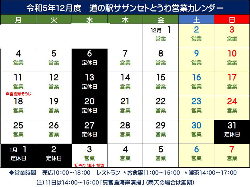 「道の駅サザンセトとうわ」年末・年始の予定
