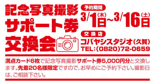 金魚島満点カード6枚で5,000円分の記念写真撮影サポート券と交換します。