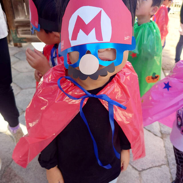 園児さん自ら手作りした仮装マスクとマントを付けて、