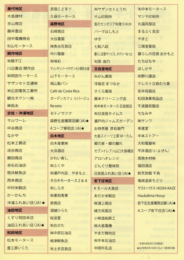 現在、周防大島町内で、加盟している221のお店・事業所で幅広く使えますので