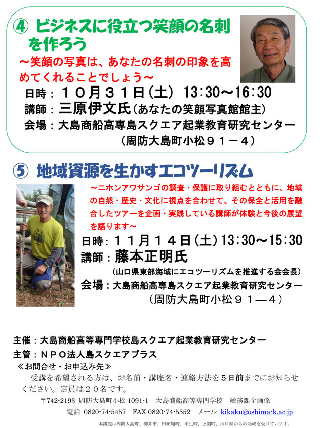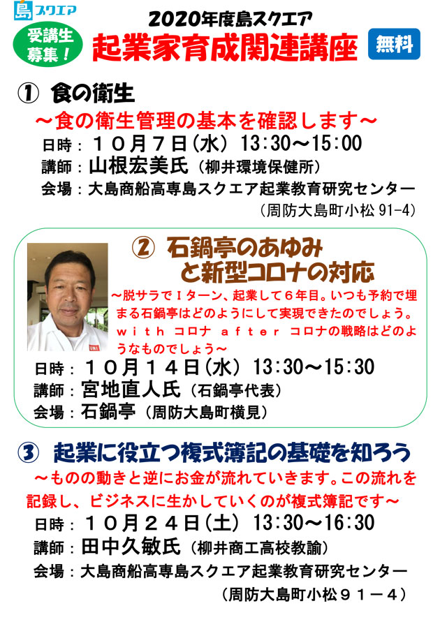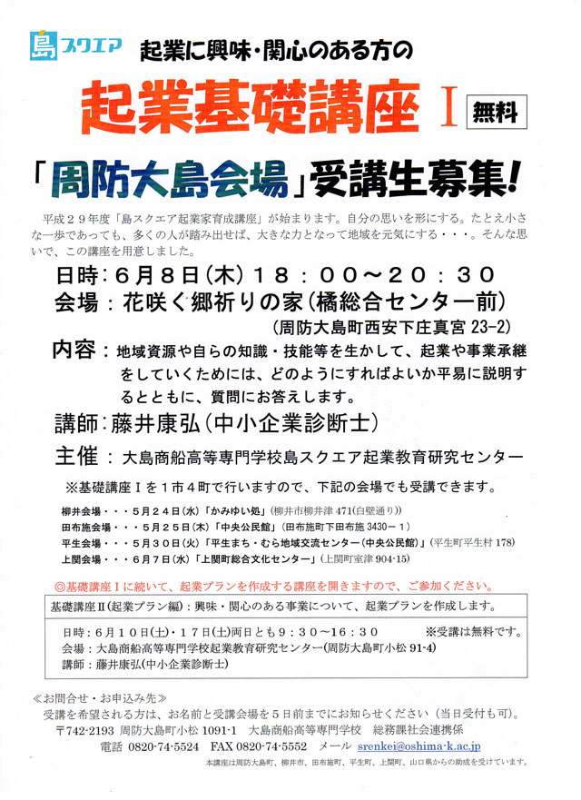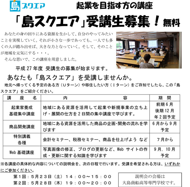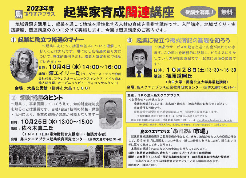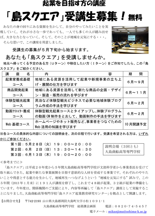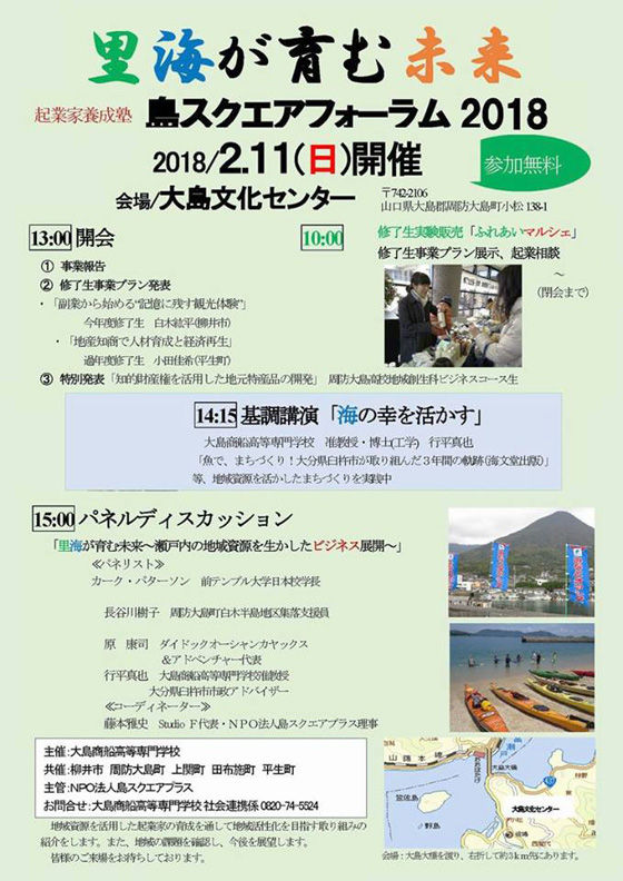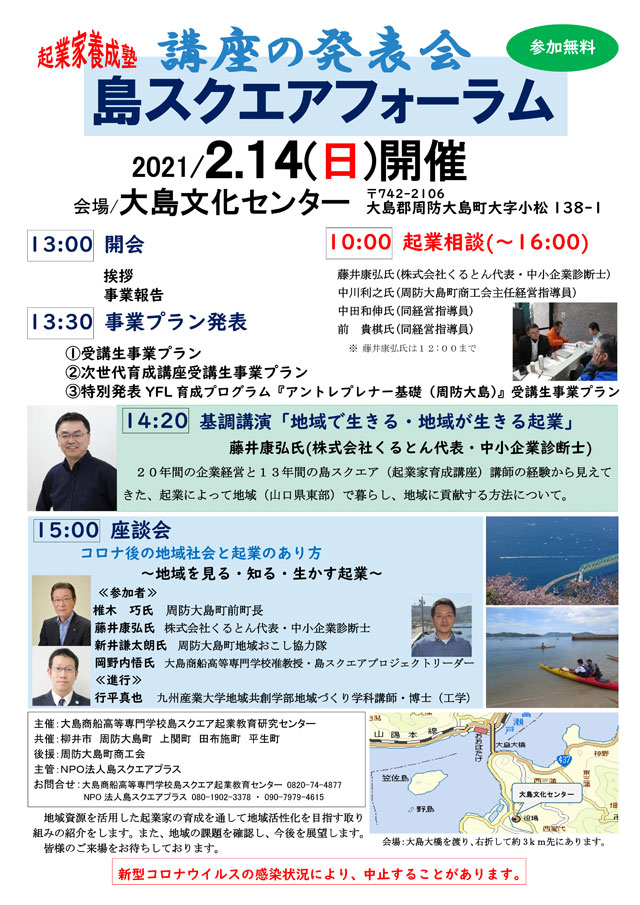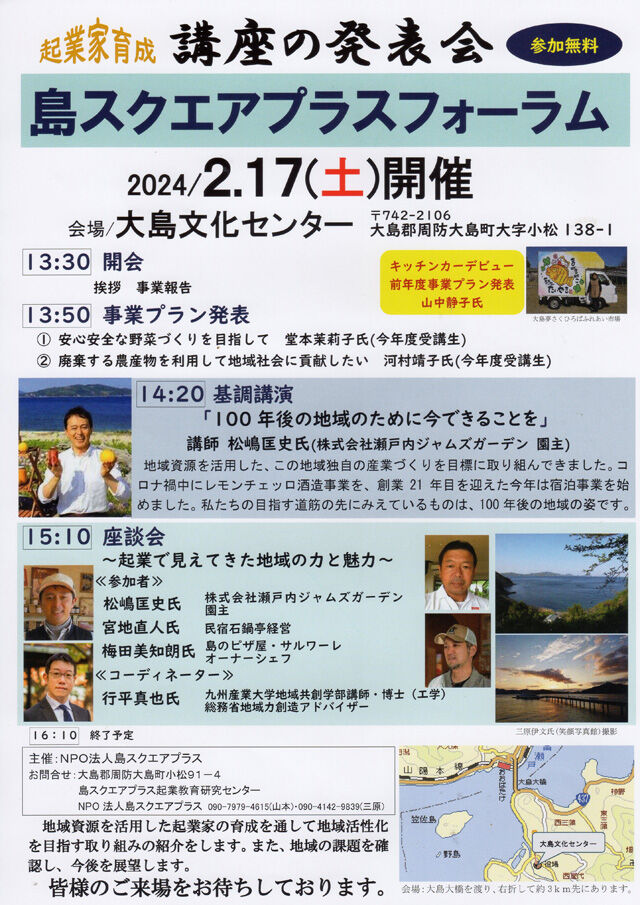 島スクエア起業教育研究センター(周防大島町小松開作)で開催します。