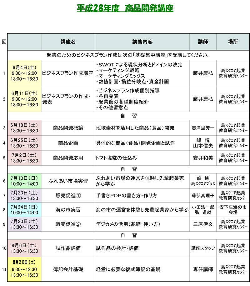基礎集中講座(ビジネスプラン作成講座)、 商品開発講座、