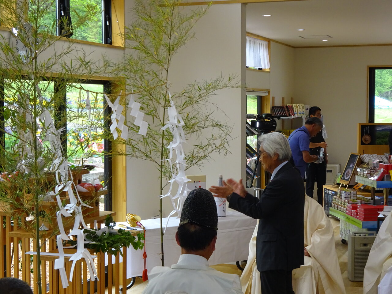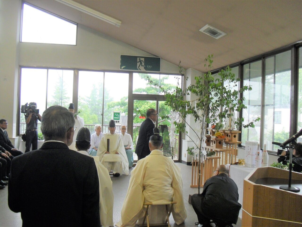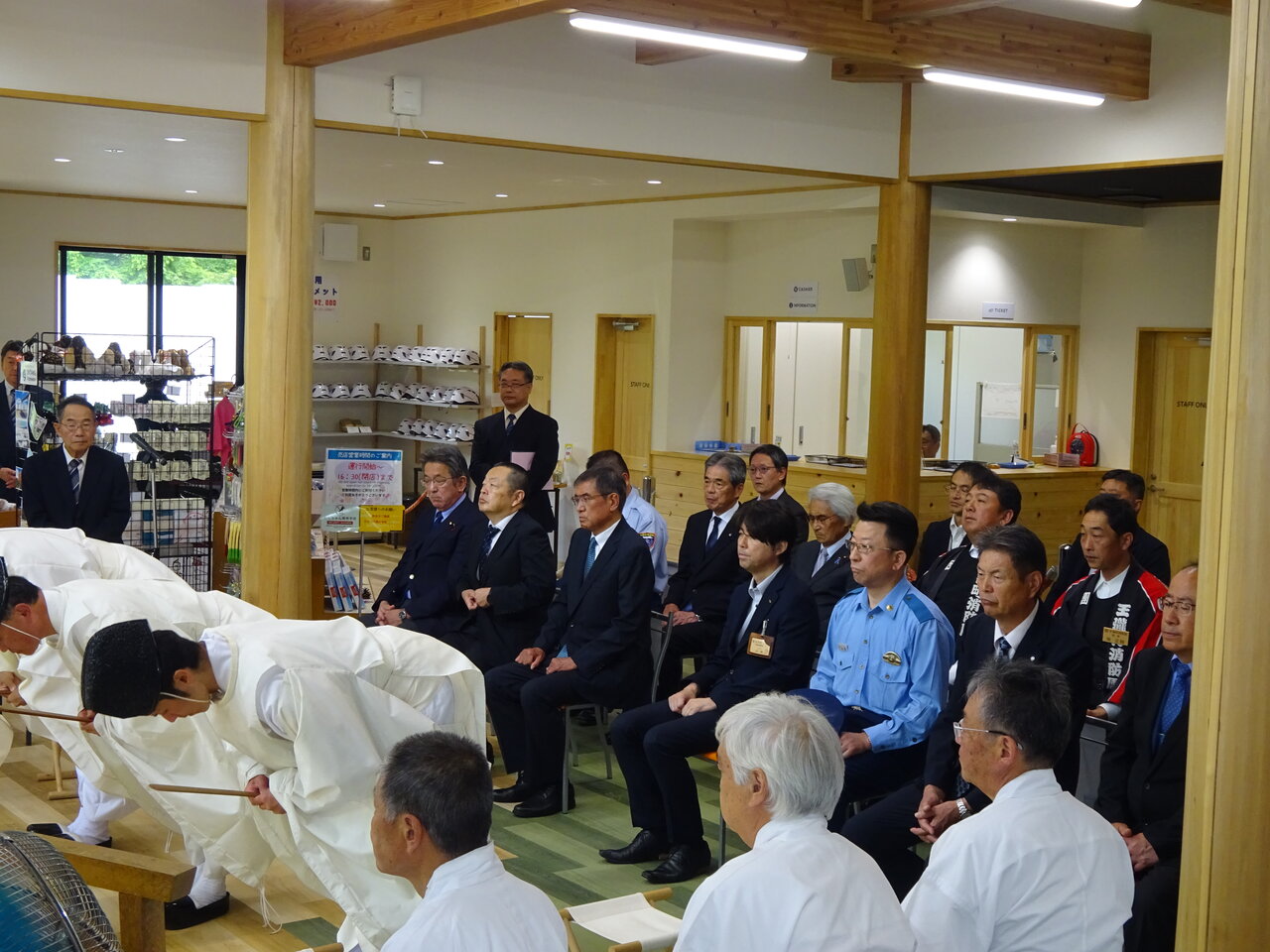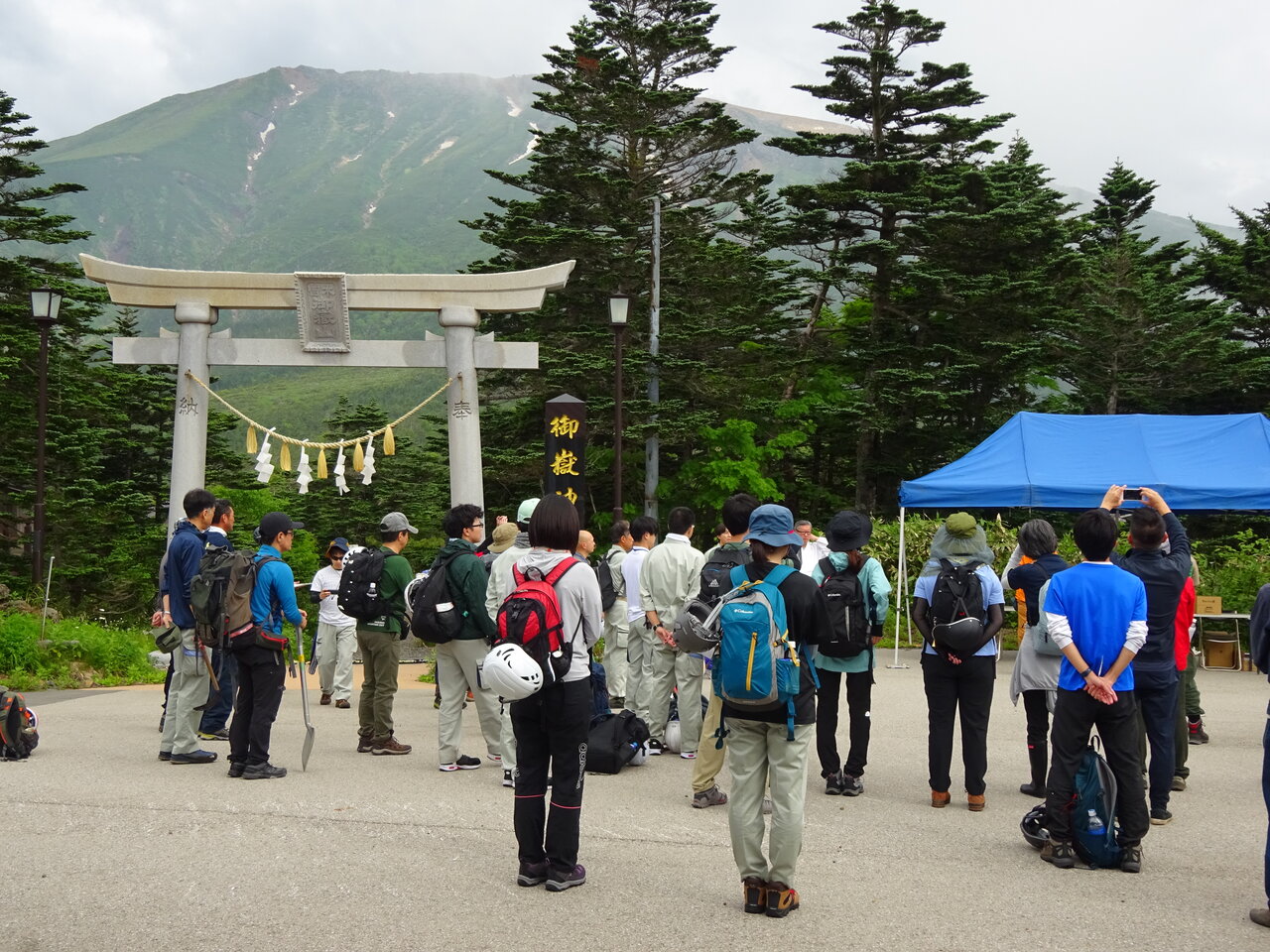 今年の開山式は木曽町にあります、おんたけロープウェイの新しく建てられたセンターハウスで開催されました。招待者16名のほか、地元関係者など総勢約30人程が参列し、令和7年度・夏山シーズンの安全を祈願しました。