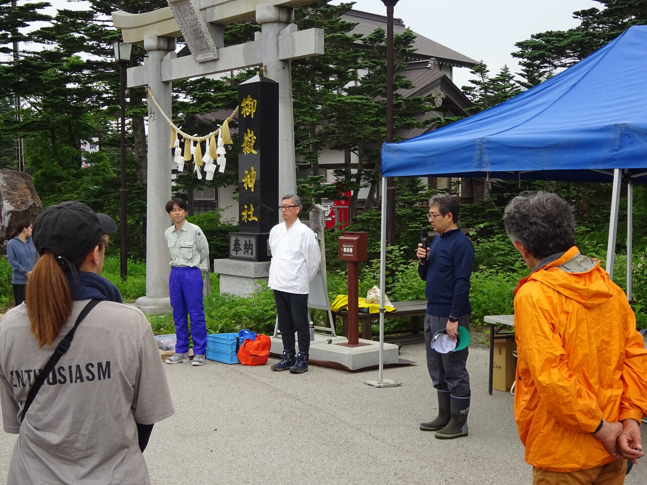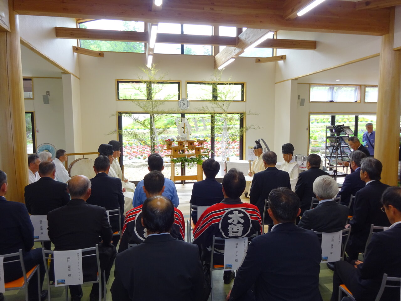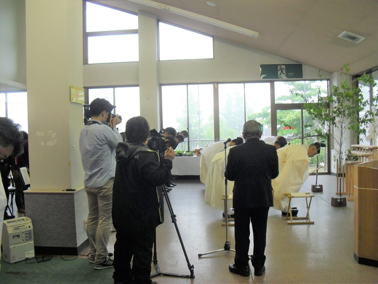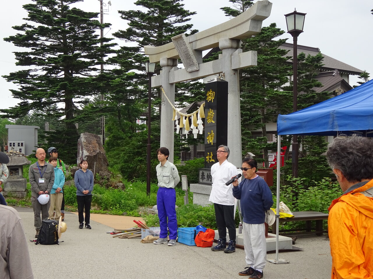 今年の開山式は木曽町にあります、おんたけロープウェイの新しく建てられたセンターハウスで開催されました。招待者16名のほか、地元関係者など総勢約30人程が参列し、令和7年度・夏山シーズンの安全を祈願しました。
