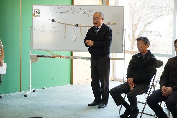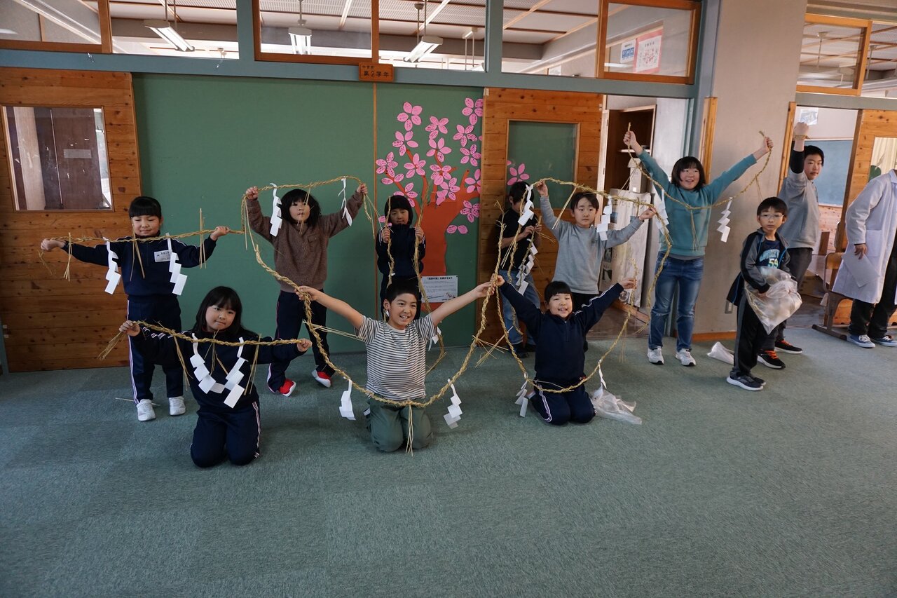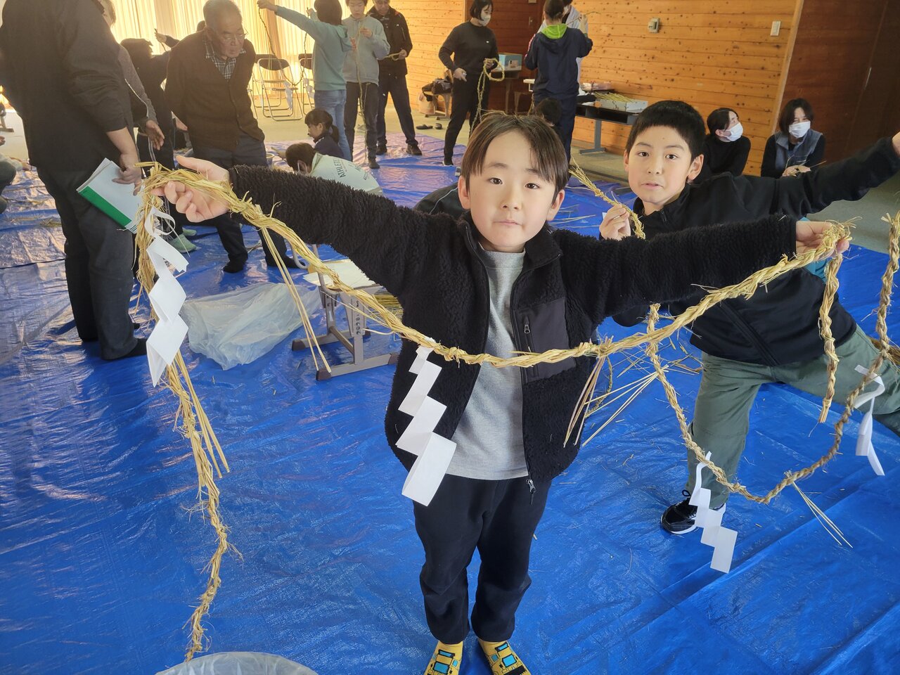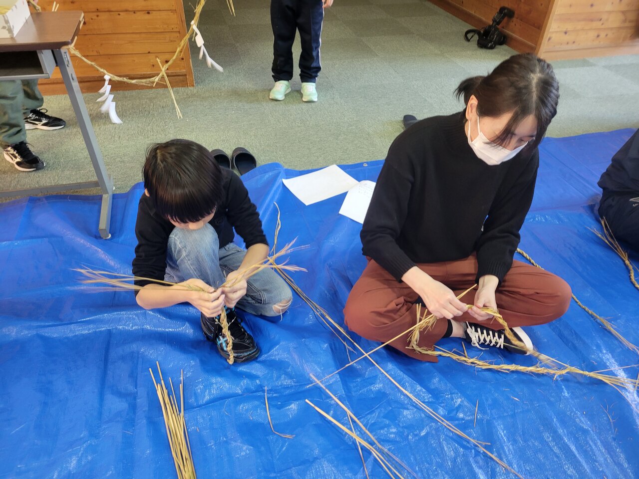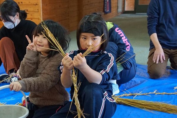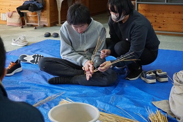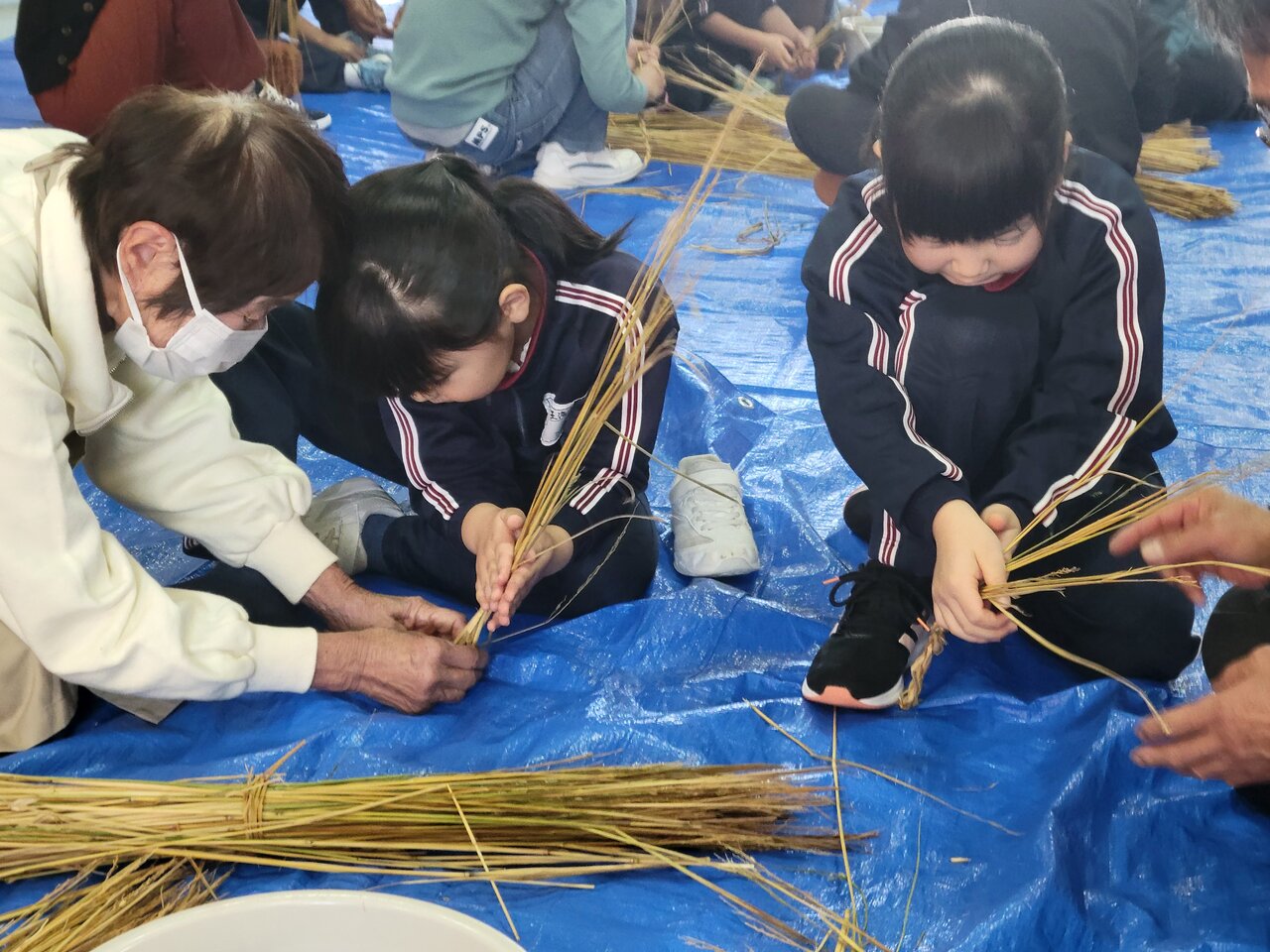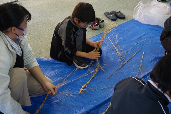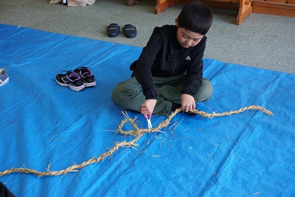王滝小学生の児童が王寿会の方を中心に地域の方にしめ縄づくりを習いました。
