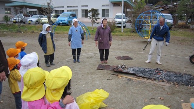 保育園で、落ちた葉っぱを集めて、焼きいもをしました。