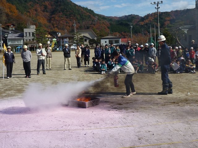 校庭に避難したのち、消防団のみなさんの指導により、本物の消火器を使った消火訓練を行いました。