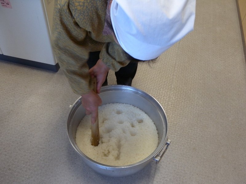 もち米とうるち米を合わせて少しやわらかめに炊き、すりこぎでつぶします。