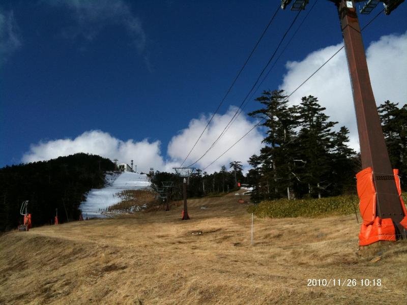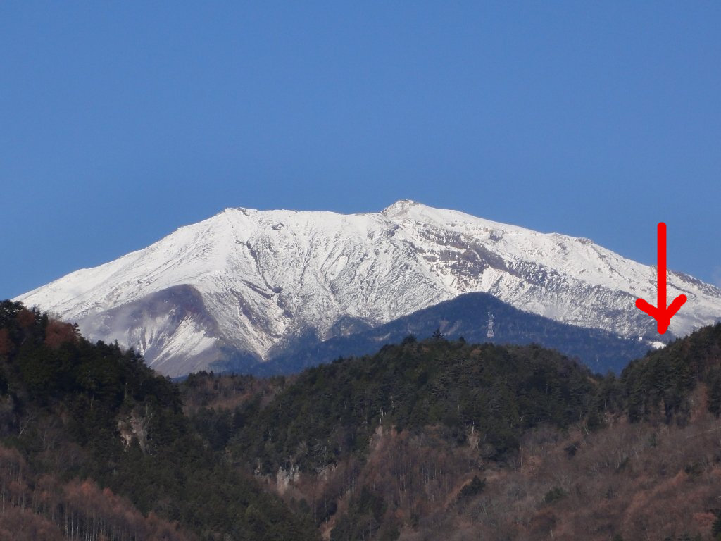 三笠山の山頂へおんたけ2240スキー場のゴンドラリフトがかかっていて、右側の稜線あたりに白く見えるのがゲレンデ。