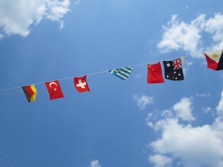 万国旗を設置して校庭の整備、得点板設置など・・・