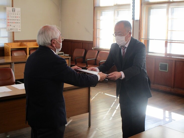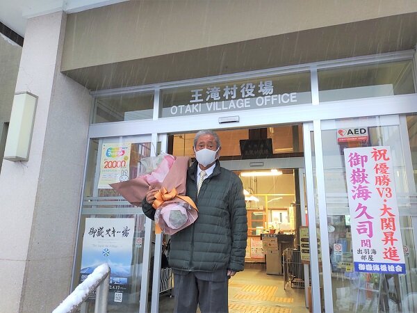 役場前では拍手で迎えられ、職員から花束を受け取り