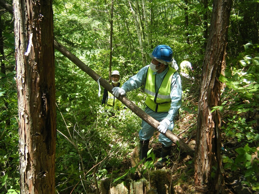 木曽郡内の森林関係者らに教わりながら間伐作業を行いました。