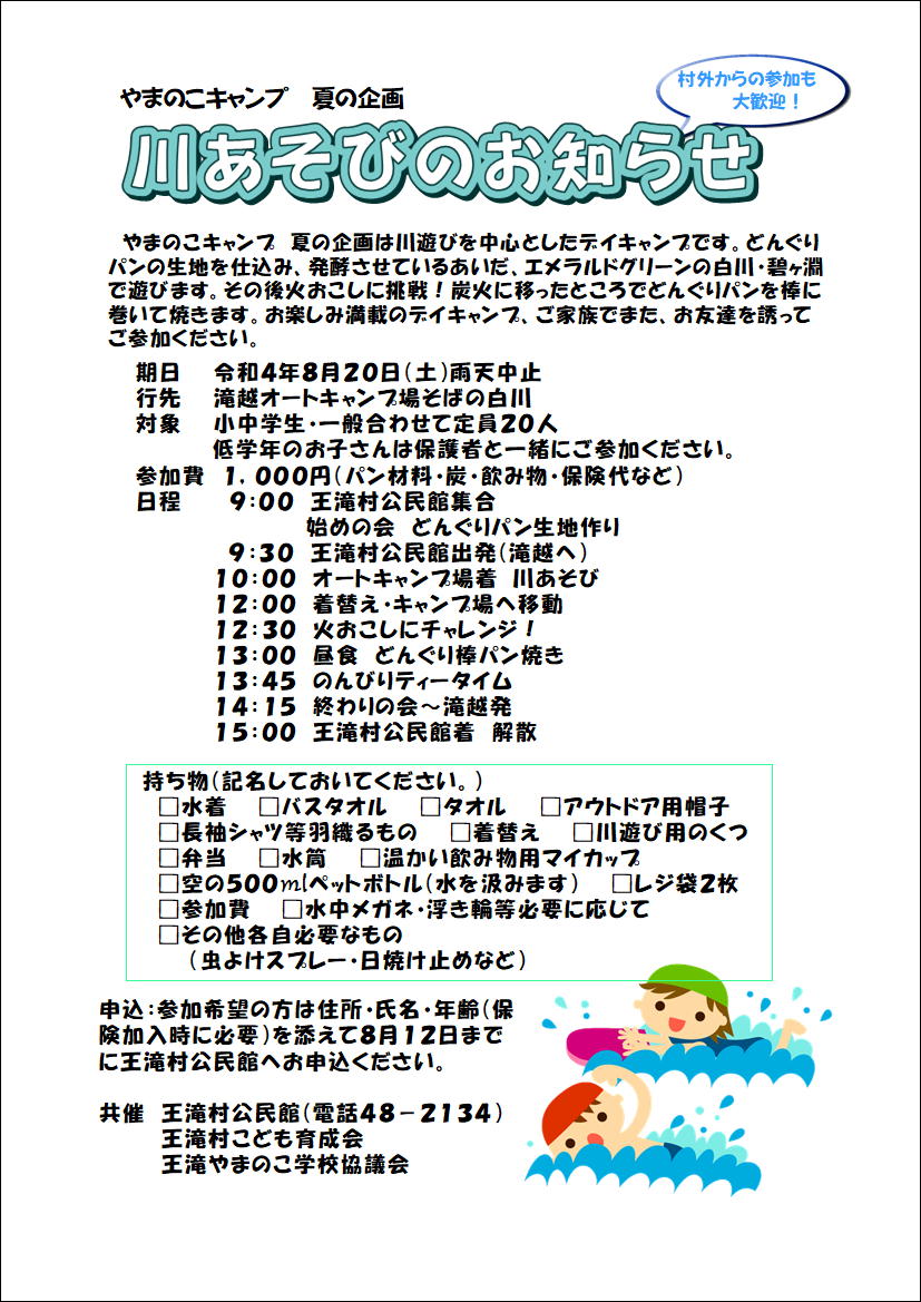 令和4年度やまのこキャンプ第2回目プログラム(川遊び)のごお知らせ