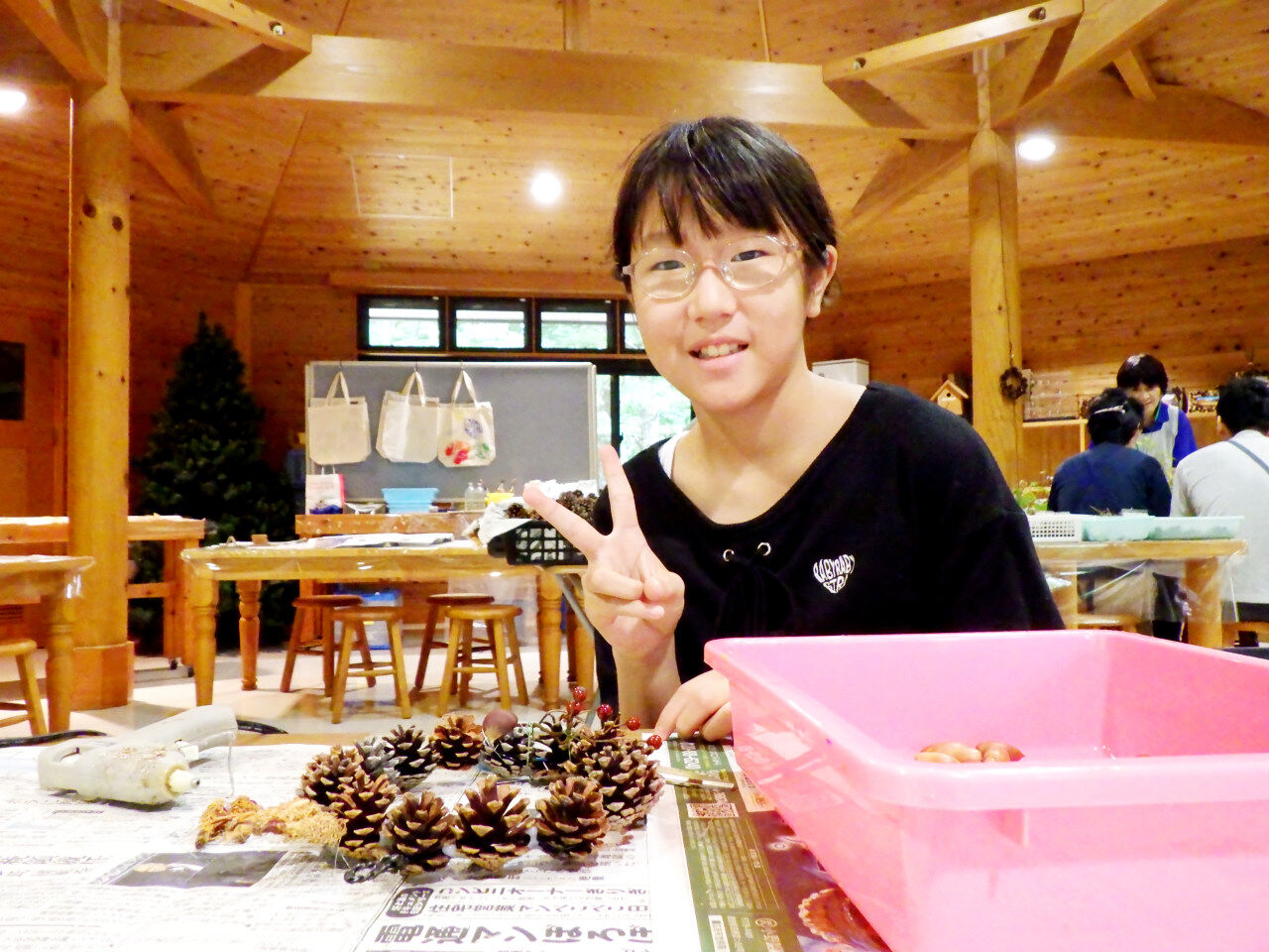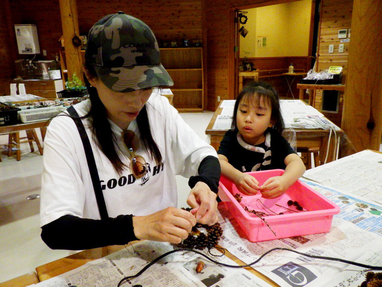 缶バッジ作りだね! 自分でガシャンって作るのたのしいね♪松ぼっくりのリースだね! 木の実をたくさん付けてお部屋に飾るんだね♪