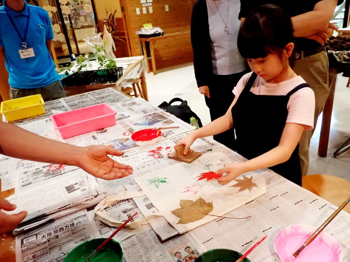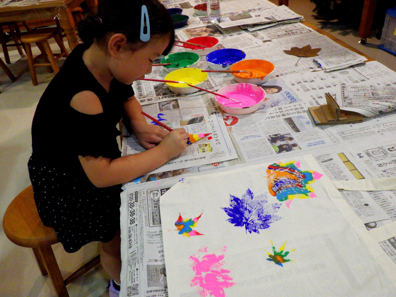 葉っぱのスタンプをペタペタ♪ カラフルで綺麗だなぁ。葉っぱのエコバッグをボクも作りたいなー!中にいれる写真は塩原の景色なんだね! 来年はボクの写真も入れてくれないかなぁ?